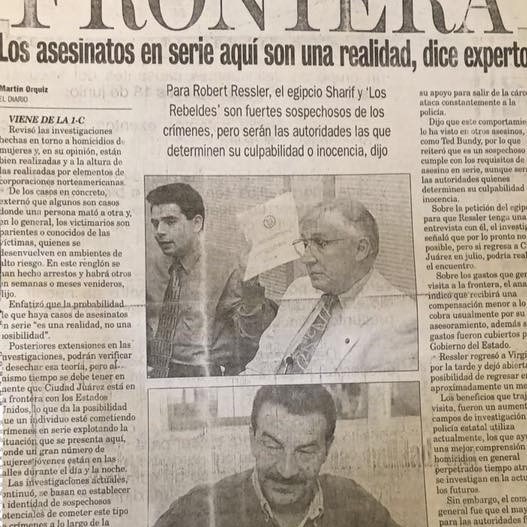 A finales de 1998, un joven Abogado, Agente del Ministerio Público, de tan solo 27 años de edad, era nombrado Fiscal Especial para la Investigación de Homicidios de Mujeres, llovieron críticas en cuanto a la experiencia del referido profesionista, sin embargo, pocos sabían que meses atrás, me había sometido a un programa de inmersión total en los casos de la Fiscalía que ahora encabezaba. Producto de la investigación de Sharif Sharif, conducida con apoyo de las Autoridades de Estados Unidos, conocí al Coronel Retirado del Ejercito, Ex Agente del FBI y uno de los originales «Mindhunters», Robert K. Ressler, a quien convencí de colaborar con nosotros en Chihuahua, no sin antes contar con la aprobación del Procurador General de Justicia del Estado para estos efectos, no solo yo tuve la oportunidad de aprender sobre homicidios sexuales, casos seriales y victimología de una fuente tan primigenia como este Investigador cuya fama es conocida a nivel mundial, capacitó a todo el equipo de la Fiscalía y, no solo eso, colaboró con nuestras investigaciones en por lo menos tres visitas a México, para algunos, sobre todo los detractores, una perdida de tiempo y de recursos, para el equipo de investigación, retirarnos el velo de los ojos y dejar atras el famoso «es una más», despues de interactuar con uno de los fundadores de la Unidad de Análisis del Comportamiento del FBI, no volveriamos a ver una escena de la misma forma, jamás.